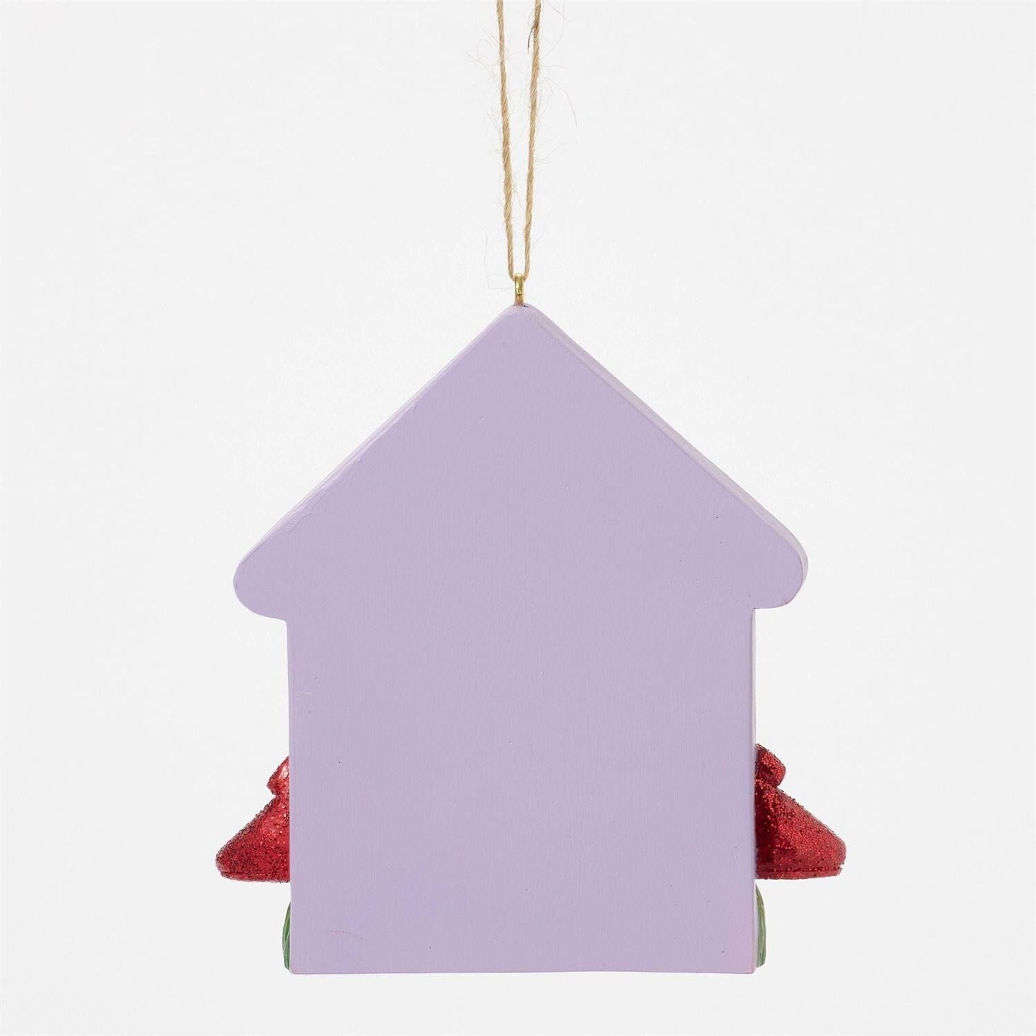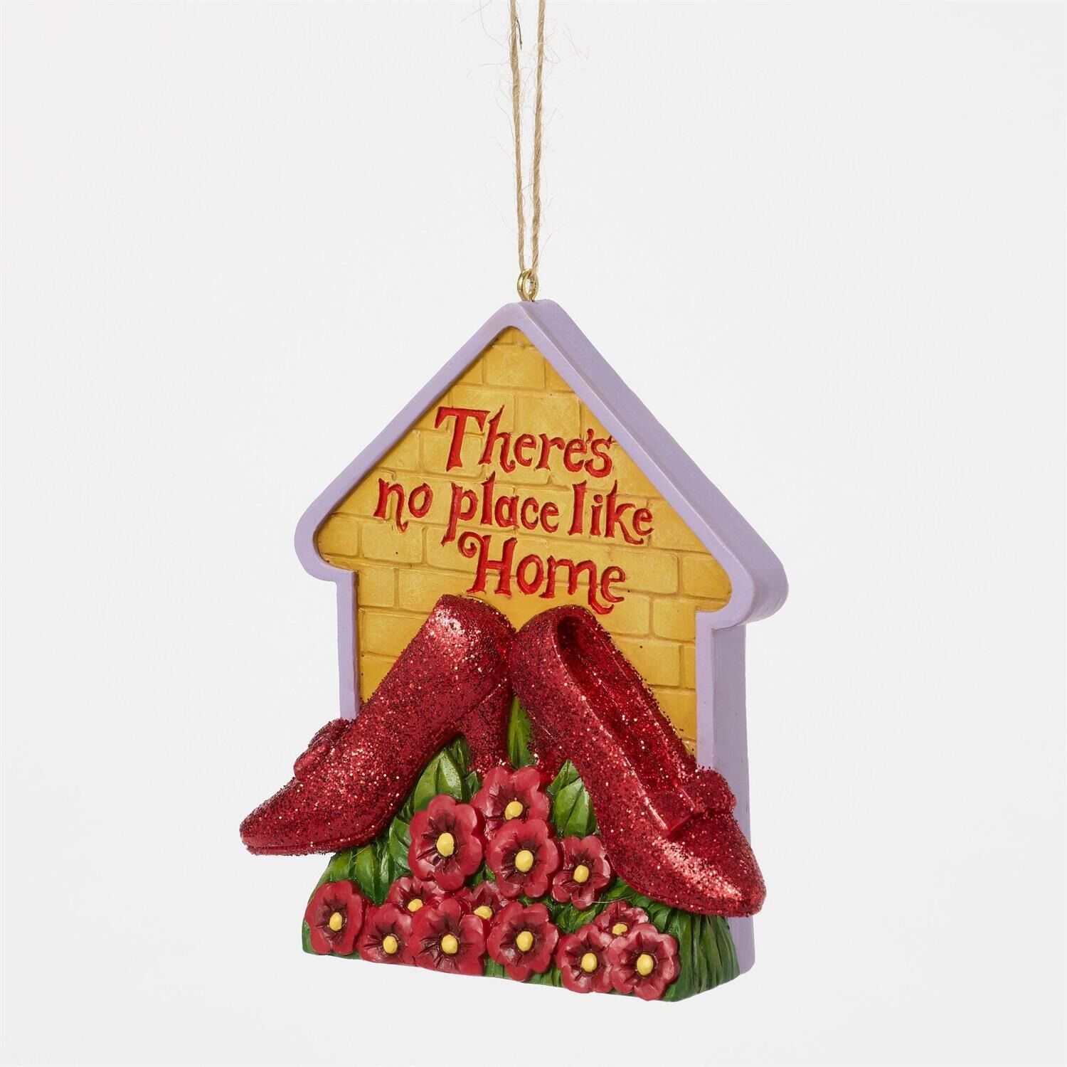 This captivating Jim Shore ornament features a Yellow Brick Road house outline adorned with Dorothy's sparkling slippers and vibrant red flowers. Inscribed with the message "There's no place like home". remember to enjoy the holidays together.