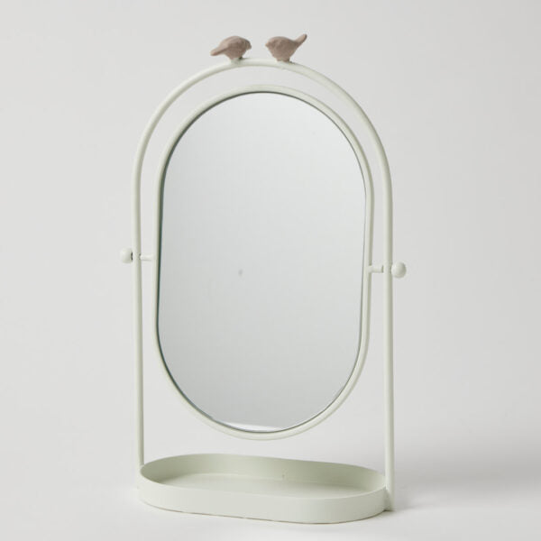Add character to the bedroom or living space with the Finch Standing Mirror. This small decorative tabletop mirror features intricate finch detailing and a charming oval shape that swivels, making it perfect for use on various surfaces and in different spaces. The lipped base is ideal for storing trinkets and jewellery when not in use.